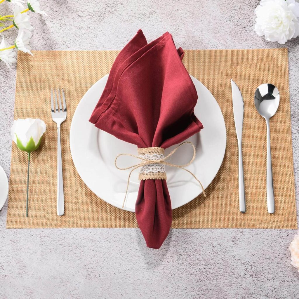 Let your gleaming cutlery take center stage, gracefully arranged around placemats. Main course utensils cozy up closest to the plate, while starters await their cue on the outer edges. Dessert spoons and forks? They perch above the setting, poised for the sweet finale.