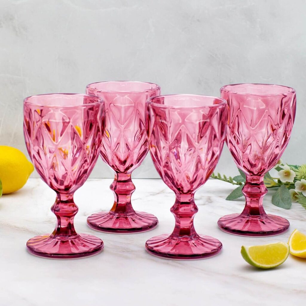 Acrylic glasses are very affordable and great fun. Be as bold as you dare, depending on the look you are aiming to achieve. Jewel colored glasses will look elaborate and ornate, whereas pastel acrylic glasses will offer a more vintage feel.